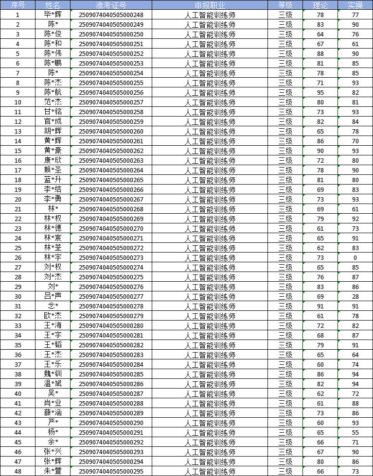 根据福建省职业技能鉴定指导中心关于印发《福建省职业技能等级认定考务实施办法(试行)》的通知有关要求,现将2025年09月07日人工智能训练师职业技能等级认定成绩予以公示(详见下图)。公示期自2025年09月08日一2025年09月12日,公示期内,如有异议,请及时与我们联系13023877857(欧老师)