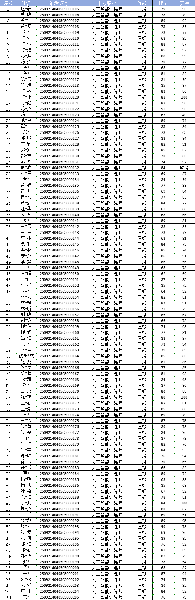 根据福建省职业技能鉴定指导中心关于印发《福建省职业技能等级认定考务实施办法(试行)》的通知有关要求,现将2025年09月21日人工智能训练师职业技能等级认定成绩予以公示(详见下图)。公示期自2025年09月22日一2025年09月26日,公示期内,如有异议,请及时与我们联系13023877857(欧老师)
