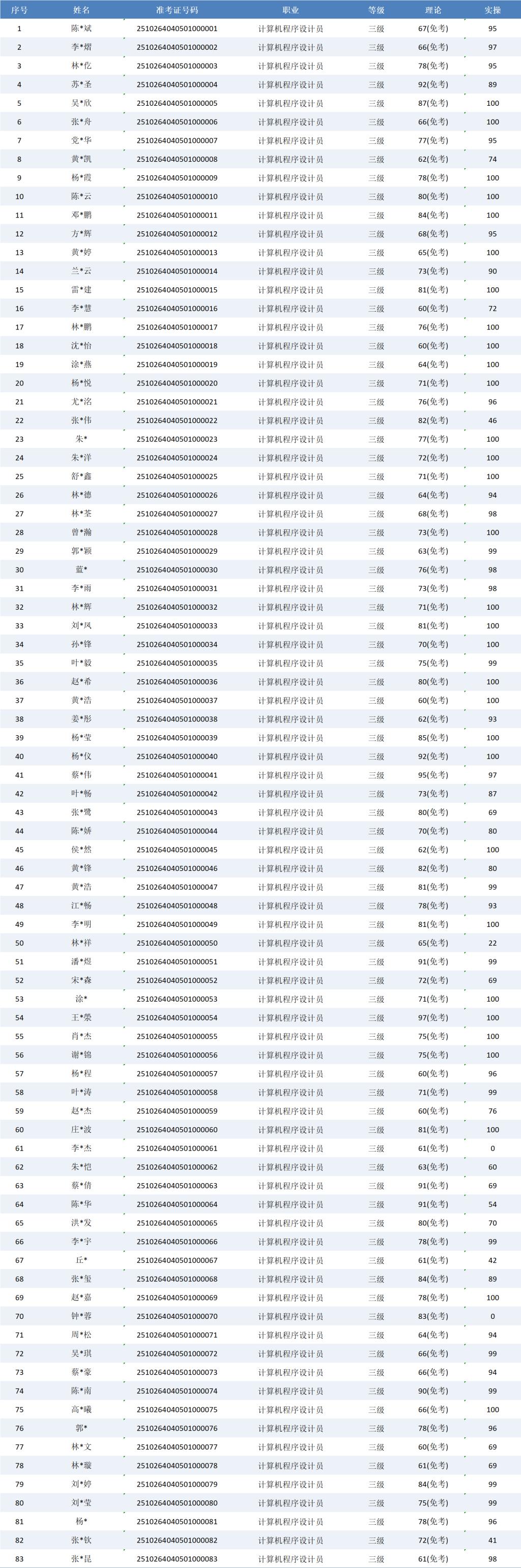 根据福建省职业技能鉴定指导中心关于印发《福建省职业技能等级认定考务实施办法(试行)》的通知有关要求,现将2025年10月26日计算机程序设计员职业技能等级认定成绩予以公示(详见下图)。公示期自2025年10月27日一2025年10月31日,公示期内,如有异议,请及时与我们联系13023877857(欧老师)