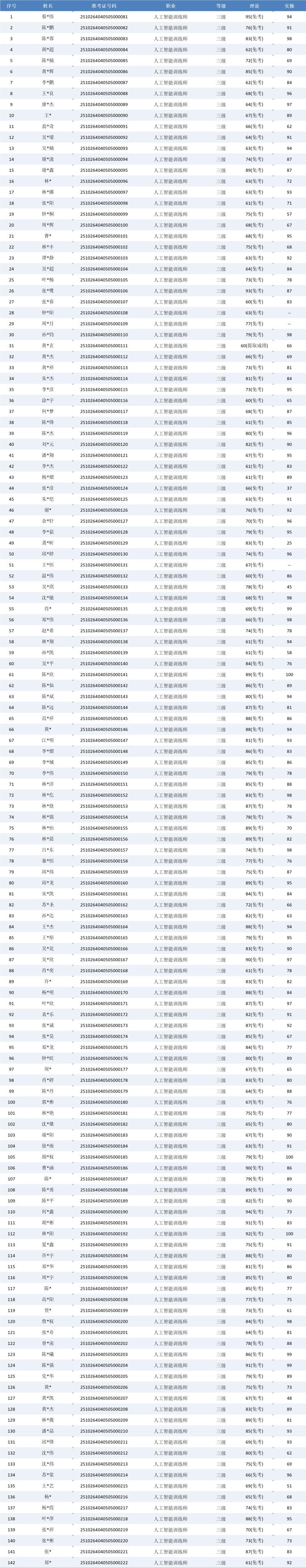 根据福建省职业技能鉴定指导中心关于印发《福建省职业技能等级认定考务实施办法(试行)》的通知有关要求,现将2025年10月26日人工智能训练师在校生职业技能等级认定成绩予以公示(详见下图)。公示期自2025年10月27日一2025年10月31日,公示期内,如有异议,请及时与我们联系13023877857(欧老师)