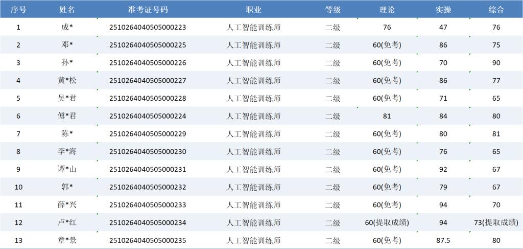 根据福建省职业技能鉴定指导中心关于印发《福建省职业技能等级认定考务实施办法(试行)》的通知有关要求,现将2025年10月26日人工智能训练师(二级)职业技能等级认定成绩予以公示(详见下图)。公示期自2025年10月27日一2025年10月31日,公示期内,如有异议,请及时与我们联系13023877857(欧老师)