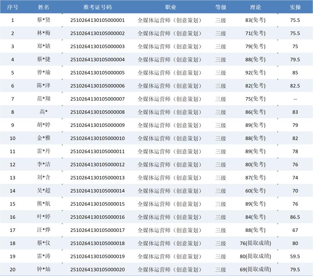 根据福建省职业技能鉴定指导中心关于印发《福建省职业技能等级认定考务实施办法(试行)》的通知有关要求,现将2025年10月26日全媒体运营师职业技能等级认定成绩予以公示(详见下图)。公示期自2025年10月27日一2025年10月31日,公示期内,如有异议,请及时与我们联系13023877857(欧老师)