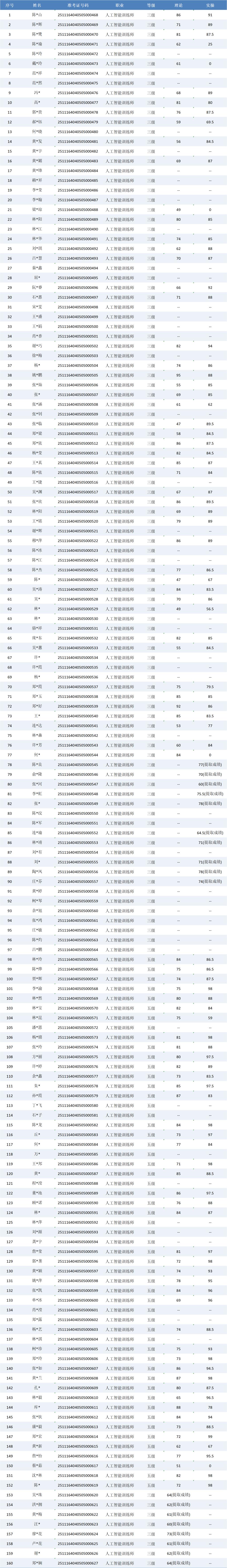 根据福建省职业技能鉴定指导中心关于印发《福建省职业技能等级认定考务实施办法(试行)》的通知有关要求,现将2025年11月16日人工智能训练师职业技能等级认定成绩予以公示(详见下图)。公示期自2025年11月17日一2025年11月21日,公示期内,如有异议,请及时与我们联系13023877857(欧老师)