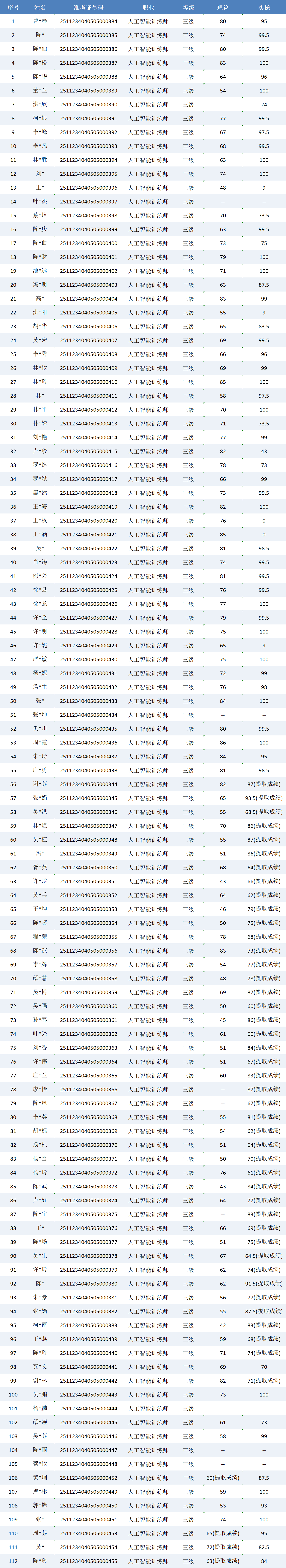 根据福建省职业技能鉴定指导中心关于印发《福建省职业技能等级认定考务实施办法(试行)》的通知有关要求,现将2025年11月23日人工智能训练师职业技能等级认定成绩予以公示(详见下图)。公示期自2025年11月24日一2025年11月28日,公示期内,如有异议,请及时与我们联系13023877857(欧老师)