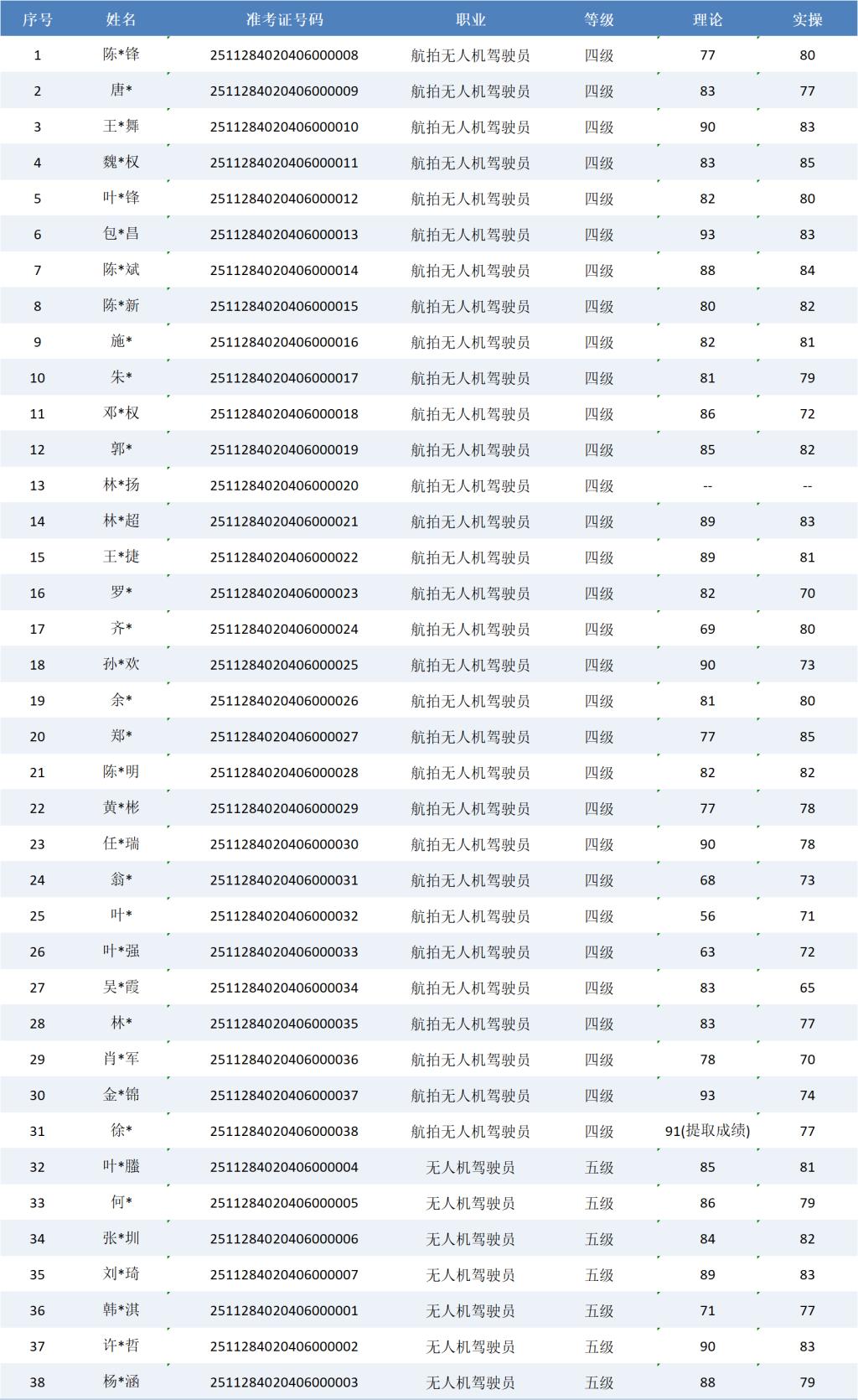 根据福建省职业技能鉴定指导中心关于印发《福建省职业技能等级认定考务实施办法(试行)》的通知有关要求,现将2025年11月28日无人机驾驶员职业技能等级认定成绩予以公示(详见下图)。公示期自2025年12月1日一2025年12月5日,公示期内,如有异议,请及时与我们联系13023877857(欧老师)