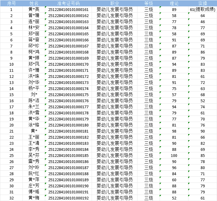 根据福建省职业技能鉴定指导中心关于印发《福建省职业技能等级认定考务实施办法(试行)》的通知有关要求,现将2025年12月28日婴幼儿发展引导员职业技能等级认定成绩予以公示(详见下图)。公示期自2025年01月06日一2026年01月11日,公示期内,如有异议,请及时与我们联系13023877857(欧老师)